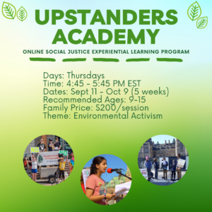 Upstanders Academy: an online social justice experiential learning program for youth ages 9 – 15, where we talk about real world issues and come up with actions we can take to help make things better. We connect with, support and empower our youth through meaningful and impactful experiences, conversations and mentorship.