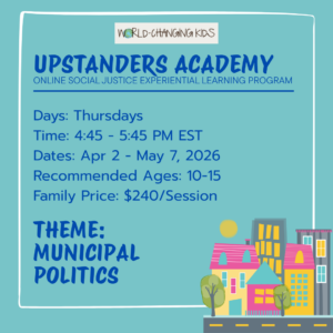 Upstanders Academy: an online social justice experiential learning program for youth ages 10 – 15, where we talk about real world issues and come up with actions we can take to help make things better. We connect with, support and empower our youth through meaningful and impactful experiences, conversations and mentorship.