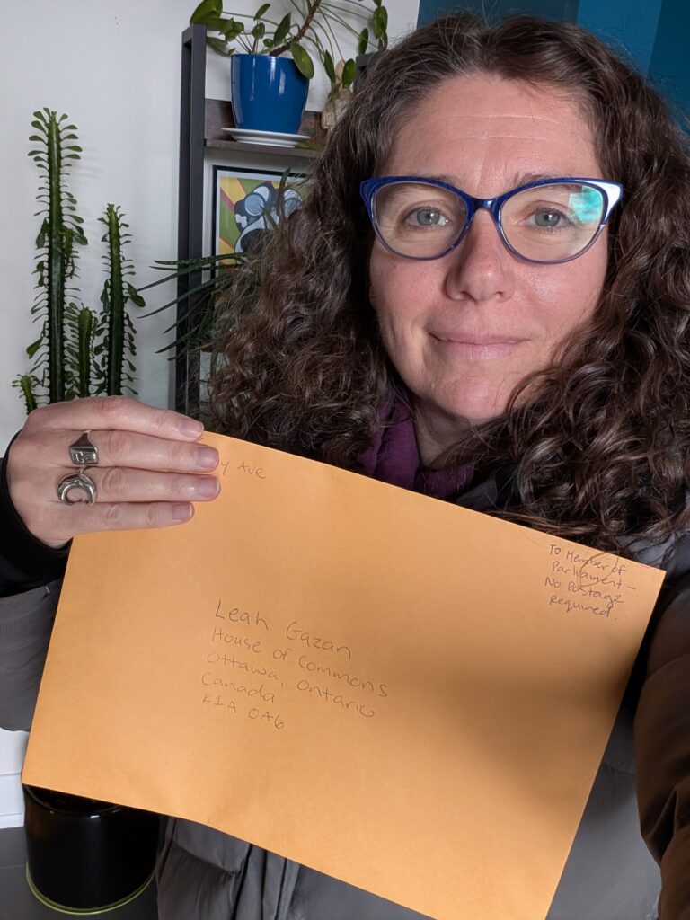 I mailed in our paper petition with 41 signatures on it, including David Suzuki’s, to Leah Gazan’s office last week! As you will notice, you do not need a stamp…